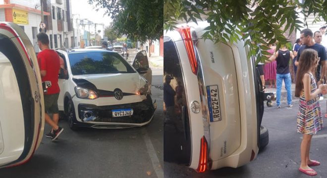 Mais um acidente de trânsito com danos materiais foi registrado nesta terça-feira em Juazeiro do Norte. Por volta das 13h30min o motorista de um veículo Hilux SW4 de cor branca subia pela Rua Santa Isabel (Bairro São Miguel) quando invadiu a Santa Luzia que é preferencial. Nessa última via trafegava um veículo UP da Volkswagen. igualmente branco, quando ocorreu a batida bem no meio do carro da Toyota.