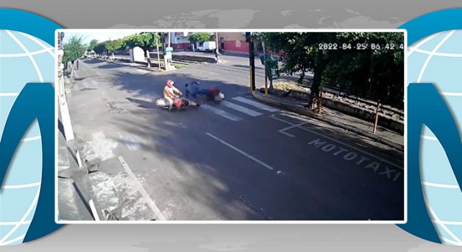 Já por volta das 7 horas desta segunda-feira câmeras de segurança voltaram a flagrar acidente no cruzamento da Avenida Carlos Cruz com a Rua São Benedito em Juazeiro. Um mototaxista vem no sentido Franciscanos/Pio XII quando bate numa moto que desce pela Rua São Benedito com o condutor levando uma caixa na garupa. O mototaxista se levanta rapidamente do seu veículo e reclama: “como é que passa o sinal vermelho cara?”.