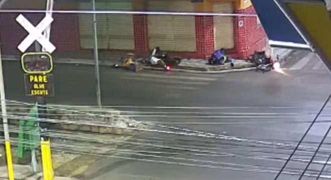 As imagens mostram claramente que um motoqueiro desce na Rua São Benedito e, mediante o sinal verde, cruza a via férrea. De repente, surge outra moto em alta velocidade trafegando pela Avenida Carlos Cruz na direção do centro. A batida foi violenta arremessando os pilotos e seus veículos no prédio da Padaria Pão Kent que funciona na esquina.