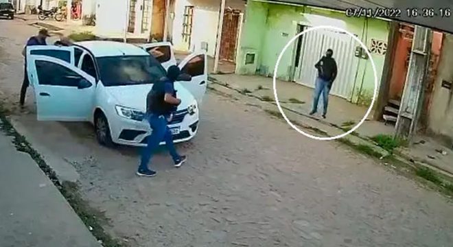 A ação foi registrada por uma câmera de segurança, que flagrou quando a vítima foi abordada por quatro pessoas encapuzados e com coletes à prova de balas.