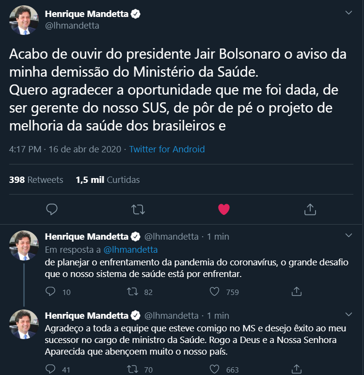 O agora ex-ministro da Saúde Henrique Mandetta, afirmou ao confirmar demissão, que o Brasil ainda não enfrentou um grande desafio no Sistema Único de Saúde. A despedida foi através do Twitter. O médico Nelson Teich deverá ser o novo comandante da pasta.