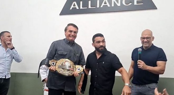 Bolsonaro foi presenteado com um cinturão e luvas de combate e agradeceu o apoio recebido. “Vocês viram renascer o patriotismo no Brasil”, disse aos lutadores.