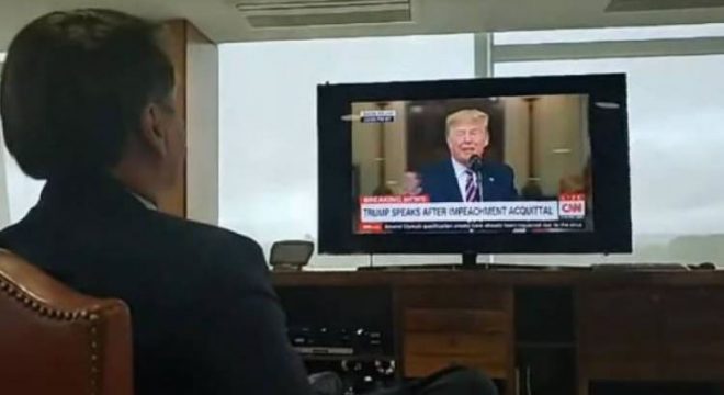 O presidente Jair Bolsonaro (sem partido) usou sua tradicional live no Facebook para mostrar o discurso de Donald Trump, presidente dos Estados Unidos, acerca de sua absolvição no processo de impeachment. Acompanhando a fala do americano, na tarde desta quinta-feira, 6, por meio de uma televisão e sendo auxiliado por um tradutor, Jair se irritou ao ser chamado de bajulador por seguidores.