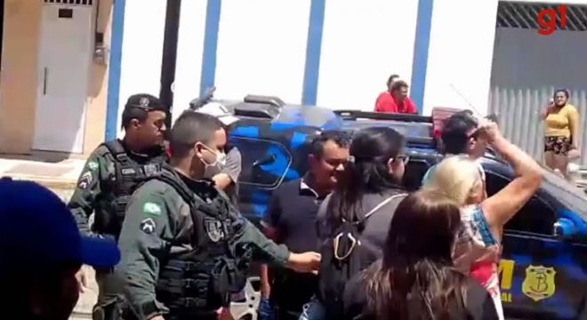 Polícia Militar tentar conter confusão entre vereador e prefeito de Pedra Branca, no Ceará. (Foto: Reprodução)