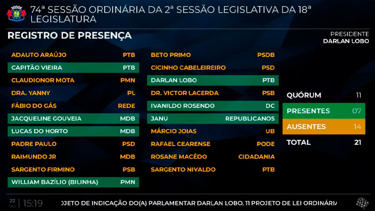 O presidente da Casa, vereador Darlan Lobo (PTB), tentou abrir os trabalhos às 15h17, mas não havia quórum mínimo para continuidade das atividades.