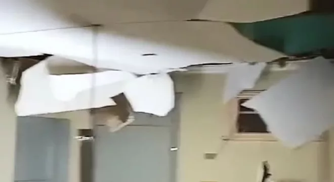Parte do teto da Prefeitura de Campos Sales, no Cariri, desabou na manhã desta segunda-feira (27) após fortes chuvas na cidade. Um vídeo que circula nas redes sociais mostra o forro do gabinete do prefeito Moésio Loiola (PSB) destruído. A sala estava vazia no momento do incidente.