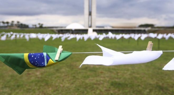 Às vésperas do fim dos trabalhos da Comissão Parlamentar de Inquérito (CPI) da Pandemia do Senado, o gramado em frente ao Congresso Nacional, em Brasília, ganhou, nesta segunda-feira (18), um grande varal com 600 lenços brancos. A instalação, feita pela organização não governamental (ONG) Rio de Paz, simboliza os mais de 600 mil mortos pela covid-19 no Brasil. Os mesmos lenços foram expostos na Praia de Copacabana, Rio de Janeiro, no início deste mês.