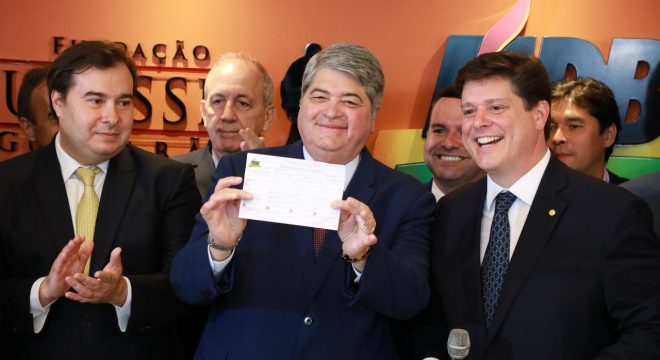 Apresentador José Luiz Datena se filia ao MDB ao lado do presidente da sigla, Baleia Rossi (à dir.), o presidente da Câmara, Rodrigo Maia (DEM) (MDB/Divulgação)