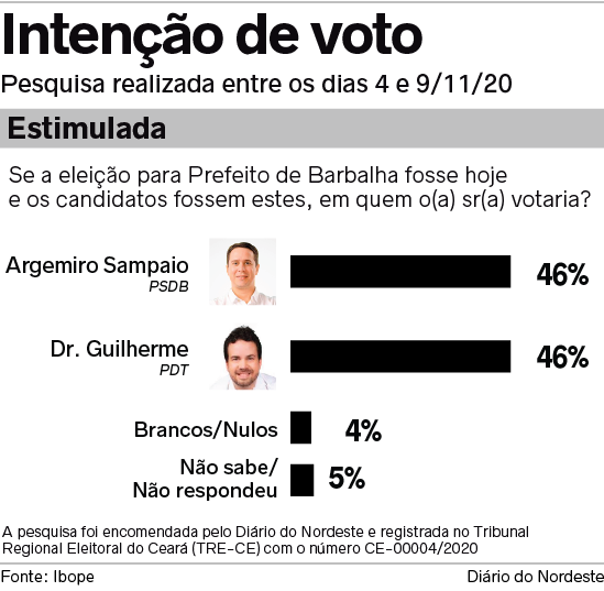 O IBOPE mostra empate numérico entre Argemiro Sampaio (PSDB) e Guilherme (PDT), em Barbalha. A pesquisa encomendada pelo Diário do Nordeste foi divulgada na noite desta quinta (12), e foi realizada entre os dias 4 e 9 de novembro. A margem de erro é de 4% para mais e para menos. Foram ouvidas 602 pessoas, e o nível de confiança é de 95%.
