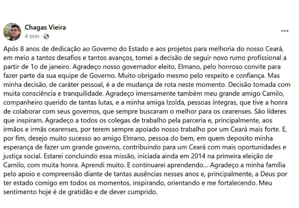 Secretário-chefe da Casa Civil desde 2020, Chagas Vieira comunicou em suas redes sociais que pretende deixar o posto no final de dezembro. Ele havia sido convidado pelo governador eleito, Elmano de Freitas (PT), para permanecer na função, porém, declinou do convite. Vieira declarou que a decisão encerra sua trajetória pública na gestão, e apontou questões pessoais para não seguir como secretário do novo governo.