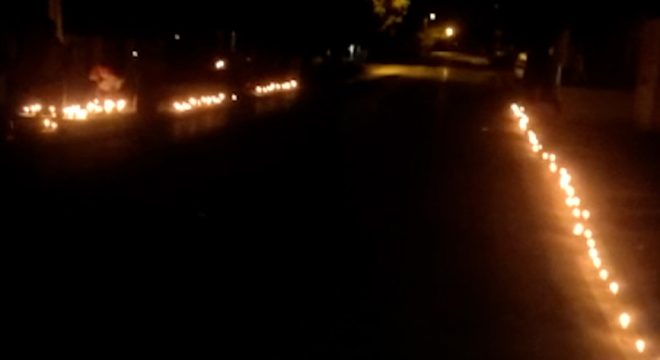 Em protesto realizado na noite do sábado (4), a população acendeu um corredor de velas ao longo de uma das principais vias do município.