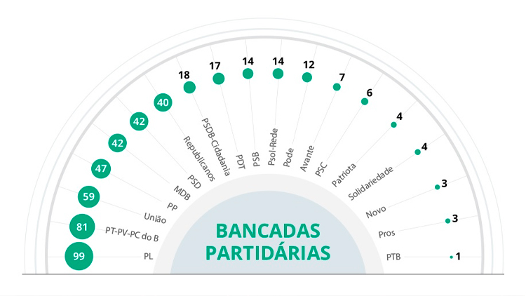 Maior bancada, o PL conseguiu 99 vagas para deputado, à frente de PT (68), União Brasil (59), PP (47) e MDB (42).