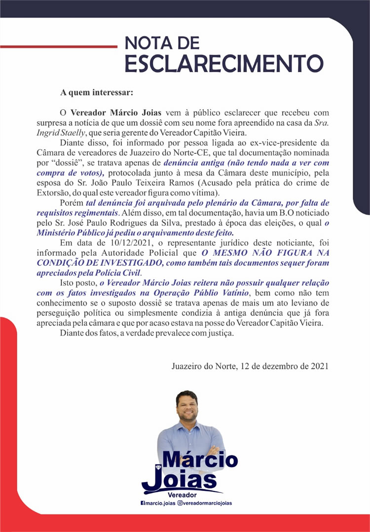 Márcio, entretanto, negou, em nota pública, a compra de votos e qualquer relação com as investigações da operação Publio Vatínio. No texto, o parlamentar afirma que o apontamento não se trata de compra de votos, mas de uma denúncia antiga, já arquivada pela Câmara Municipal.