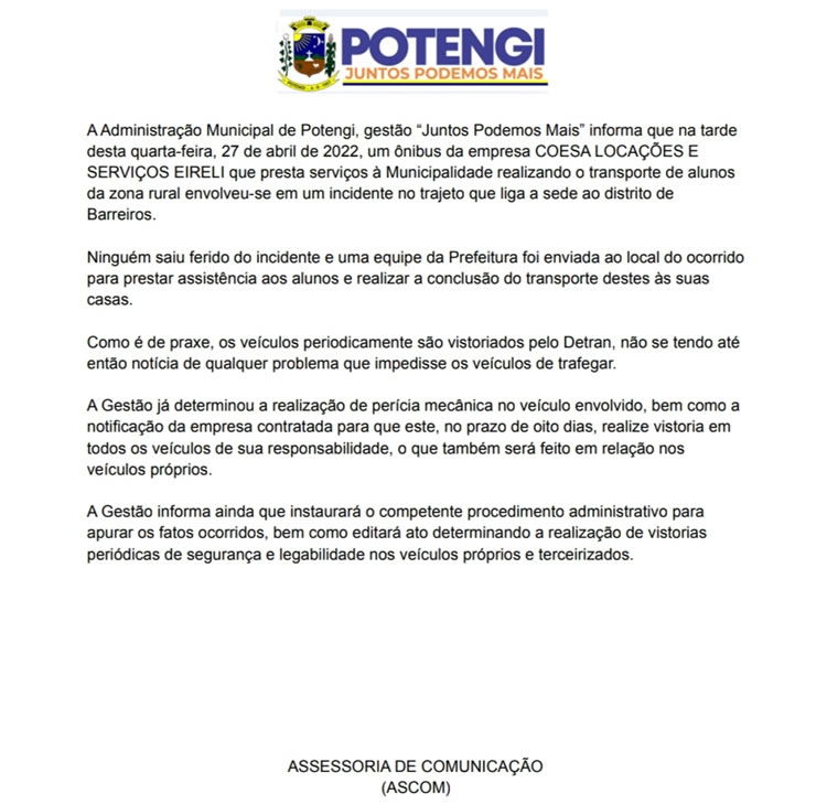 A Administração Municipal de Potengi, veio a público esclarecer o que classificou como incidente. Na última quarta-feira (27), um ônibus que faz o transporte de alunos da zona rural se envolveu em um incidente no trajeto que liga a sede ao distrito de Barreiros.