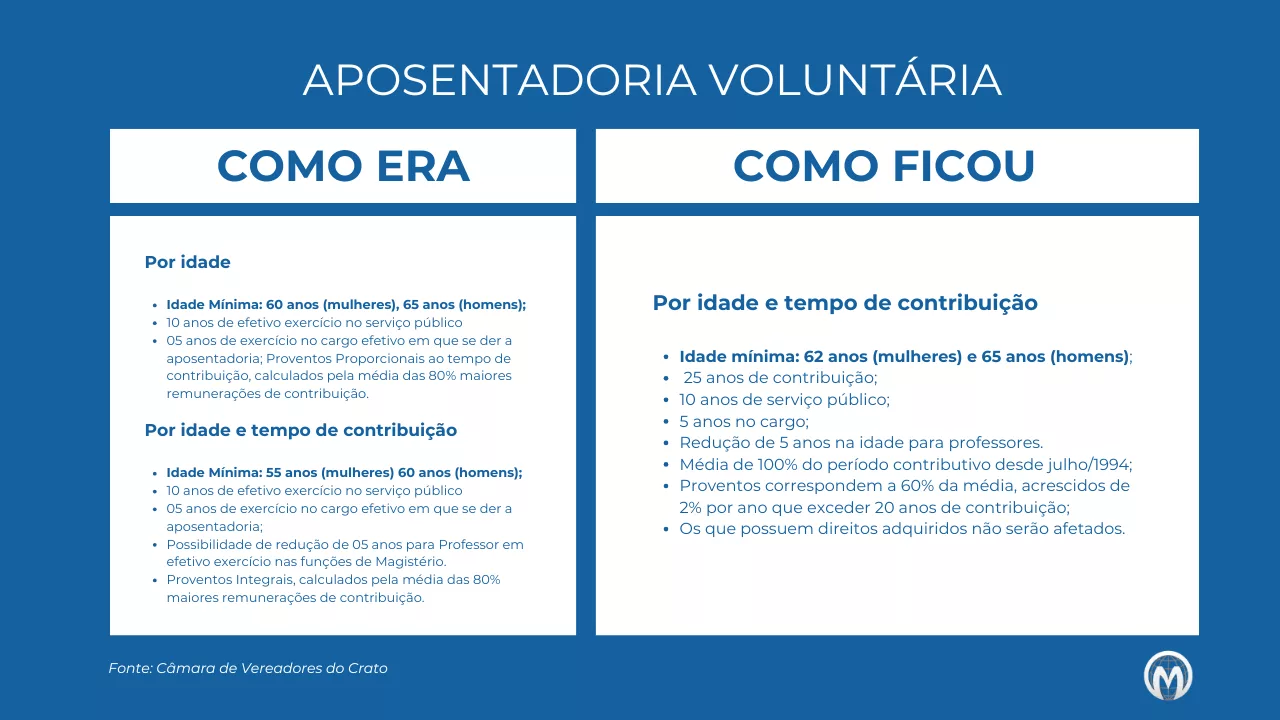 A reforma aumentou a idade mínima para aposentadoria. Agora, é necessário ter 62 anos para mulheres e 65 para homens, com 25 anos de contribuição, além dos 10 anos de serviço público e 5 no cargo. Professores mantêm a redução de cinco anos na idade mínima. Os que possuem direitos adquiridos não serão afetados.