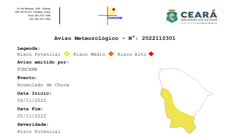 Até este sábado (5), a região sul e parte do oeste do Ceará estão sujeitas à ocorrência de acumulado de chuva. O aviso de risco potencial foi emitido pela Fundação Cearense de Meteorologia e Recursos Hídricos (Funceme) na sexta-feira, 4.