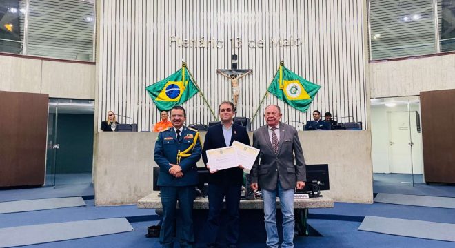 O gestor, que é especialista em Medicina de Emergência, recebeu o certificado das mãos do comandante dos Bombeiros, cel. Ronaldo Araújo, e do deputado estadual Manoel Duca, propositor da sessão.