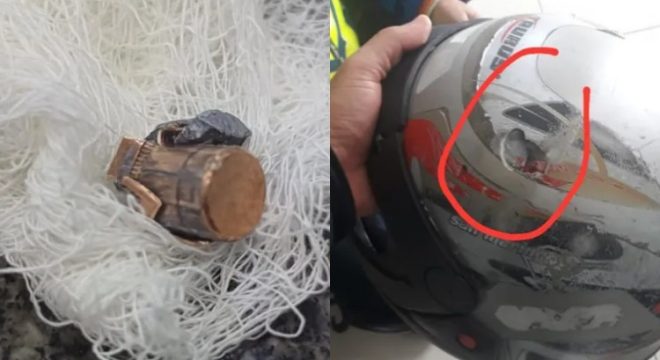 O projétil ficou alojado na estrutura do capacete e ainda chegou a atingir o couro cabeludo do entregador.