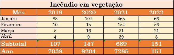O Corpo de Bombeiros Militar do Ceará (CBMCE) divulgou, nesta segunda-feira (23), o balanço dos incêndios em vegetação registrados no 1º quadrimestre de 2022, em todo o estado. Apesar da sensível redução em relação aos dados do mesmo período de 2021, os números permanecem superiores a 2019 e 2020.