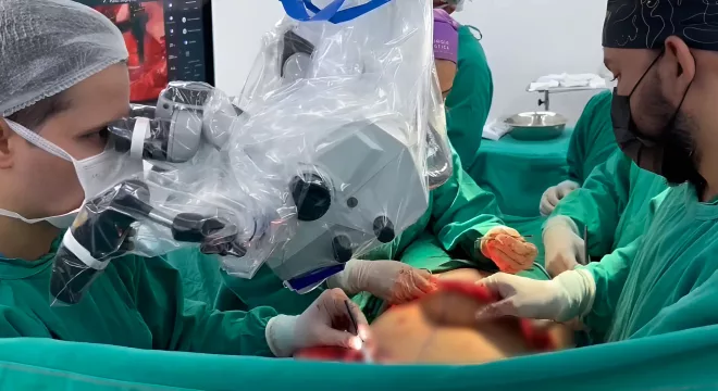 De acordo com o cirurgião plástico do HGF, Roney Fechine, o procedimento é de alta complexidade e realizado por meio de microcirurgia. “Utilizamos um microscópio para conectar os vasos sanguíneos menores, garantindo a vascularização do retalho de pele que formará a nova mama e estabelecendo a comunicação da região com o restante do corpo”, explica o médico.