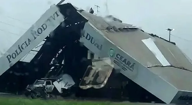 O teto do posto da Polícia Rodoviária Estadual (PRE), em Aquiraz, na Região Metropolitana de Fortaleza, desabou nesta quarta-feira (27). O desabamento aconteceu após as intensas chuvas que caíram durante a madrugada na região. Até o momento, não há informações sobre feridos.