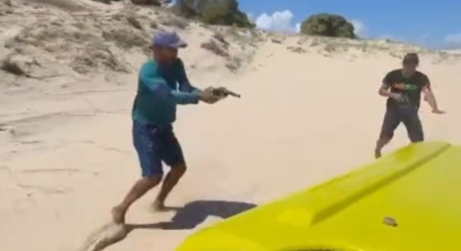 Dois turistas que passeavam de buggy pelas dunas de Cumbuco, no município de Caucaia, registraram uma tentativa de assalto que sofreram nesta manhã (9). Em vídeo publicado nas redes sociais, é possível ver o momento em que dois homens armados tentam parar o veiculo para efetivar o assalto. O furto só não ocorreu porque o motorista acelera.