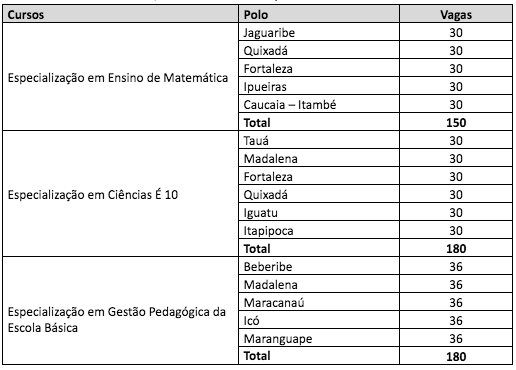 A Universidade Estadual do Ceará (Uece) abriu inscrições com 540 vagas para cursos de especialização em 13 polos do Ceará. Cursos como Ciência é 10, Ensino de Matemática no Ensino Médio e Gestão Pedagógica da Escola Básica são oferecidos na modalidade on-line pela Universidade Aberta do Brasil.