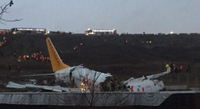 A fuselagem da aeronave, da companhia privada Pegasus, partiu em dois e pegou fogo depois de sair da pista do aeroporto internacional Sabiha Gökçen, escorregadia em razão da forte chuva que cai em Istambul, segundo imagens transmitidas pelo canal CNN-Türk.
