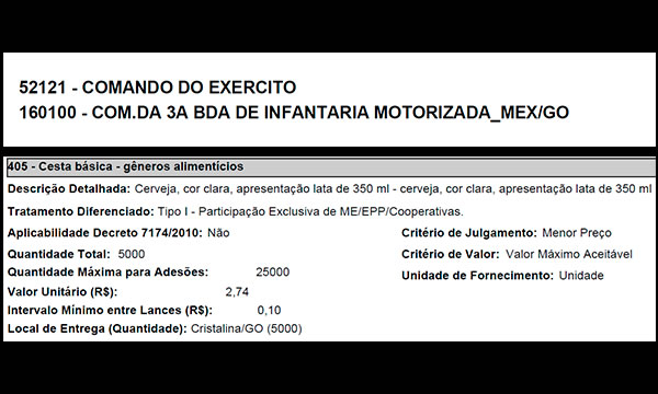 A cerveja entrou na lista de itens da “cesta básica”, pelo menos entre os militares. O Comando da 3ª Brigada de Infantaria Motorizada, em Cristalina (GO), publicou uma lista de compras de gêneros alimentícios e incluiu 5.000 latas de cerveja de 350 mililitros. A compra toda de itens da cesta básica vai custar 3,2 milhões de reais.