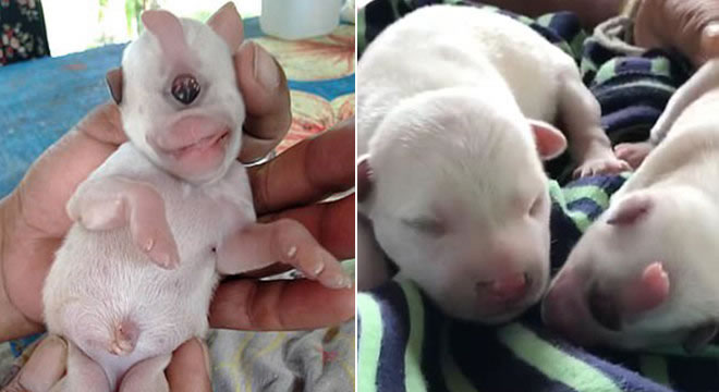 Um filhote de cachorro está chamando atenção na cidade de Chachoengsao, na Tailândia. O pequeno nasceu, no último domingo (2), com apenas um olho no meio da testa e três orelhas.