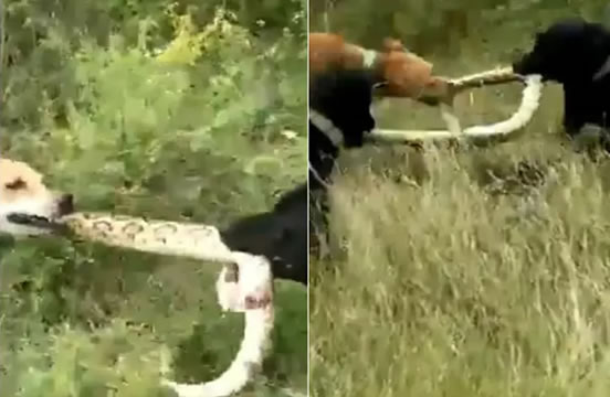 Trio de cães despedaçou uma serpente mortal, que se preparava para dar o bote em um fazendeiro (Reprodução)