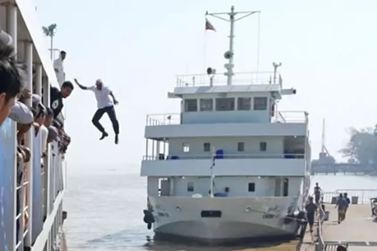 O capitão de um navio pulou de uma altura de 12 metros para salvar uma passageira que havia caído no Rio Yangon, às margens do porto de Dala (Mianmar).