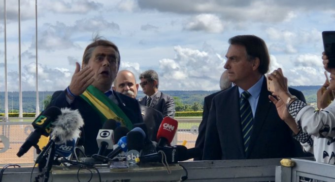 O presidente Bolsonaro apareceu hoje (4) pela manhã, em Brasilia, com o humorista Carioca, ex-integrante do Pânico. Nas entrevistas que costuma dar, o presidente deu lugar ao personagem dele mesmo, interpretado pelo ator.