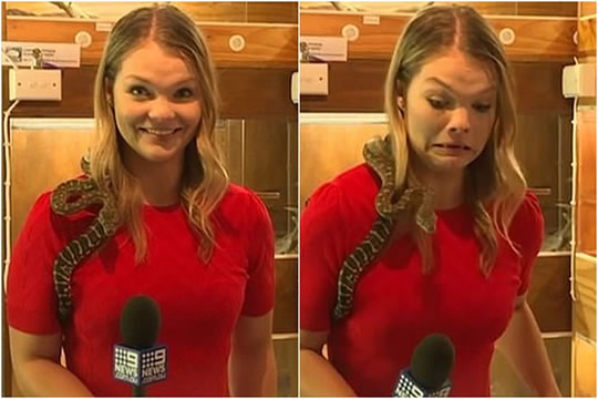 A repórter Sarah Cawte, do Canal 9 da Austrália, gravava uma reportagem sobre segurança com cobras quando tomou um susto: a píton que estava nos ombros da jornalista atacou o microfone. Três vezes. Veja o vídeo abaixo.