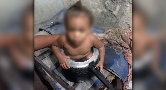 Uma criança de 1 ano e 9 meses de idade ficou presa dentro de uma panela de pressão e foi resgatada pelo Corpo de Bombeiros. O caso aconteceu em Goiana, na Região Metropolitana do Recife, na noite da sexta-feira (6) e foi divulgado pela corporação na manhã deste sábado (7).