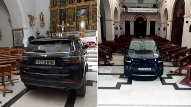 O SUV arrebentou a porta de madeira e colidiu com os bancos antes de parar em frente ao altar da igreja de São João Evangelista, contou o “NIUS Diário”. Por sorte, o templo estava vazio.