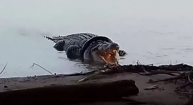 Governo oferece recompensa para quem tirar pneu preso em crocodilo