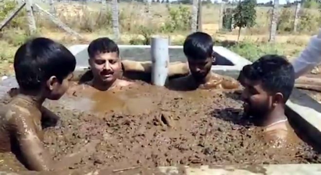 Indianos tomam banho de fezes de vaca para, segundo eles, terem imunização contra o coronavírus: Eles encheram um pequeno tanque com material fecal e tomaram um banho completo. Em certo momento, eles mergulham sem medo da felicidade e de infecções.
