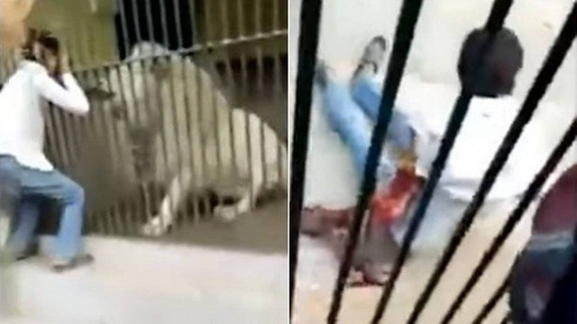 Um leão albino atacou o tratador no momento em que era alimentado em zoológico de Karachi (Paquistão). Um vídeo feito por um visitante flagrou o momento em que o felino mordeu o braço esquerdo de Kannu Piraditta.
