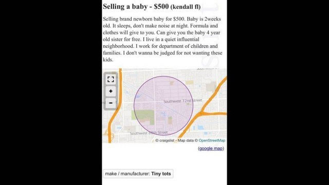 Policiais do estado de Miami, nos Estados Unidos, tentam descobrir a responsável por publicar um anúncio em um popular site americano de vendas, o Craigslist, pretendendo vender um bebê recém-nascido por US $ 500, aproximadamente R$ 2.000. A publicação ainda diz que a irmã do bebê de 4 anos vai de brinde para quem fechar a compra.