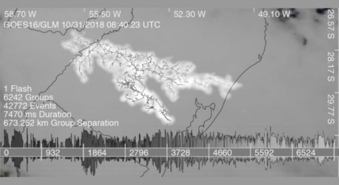 ⚡Maior relâmpago já registrado pelo Geostationary Lightning Mapper (GLM) ocorreu sobre o estado do Rio Grande do Sul no dia 31/10/2018.