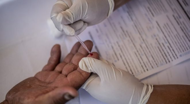 Profissional de saúde coleta sangue de homem durante exame de detecção do HIV (AFP)