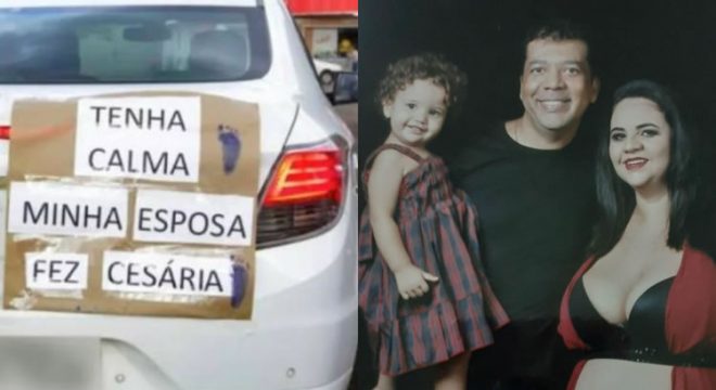 O pai de segunda viagem Marcos Cândido, de Campo Grande, no Mato Grosso do Sul, teve uma ideia pra lá de criativa — e carinhosa — para proteger a esposa e a filha recém-nascida no trajeto da maternidade para casa. Ele instalou uma placa no carro com o anúncio: “Tenha calma. Minha esposa fez cesárea.”