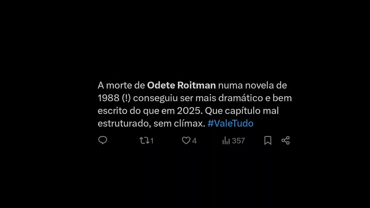 No entanto, a cena, uma das mais aguardadas pelo público, gerou opiniões diversas nas redes sociais. Parte dos espectadores elogiou a intensidade da atuação de Débora Bloch, enquanto outros criticaram o roteiro e a direção, especialmente a última fala da personagem: “Pra que essa barbárie? Meu bem, ninguém tem coragem de atirar em Odete Roitman.”