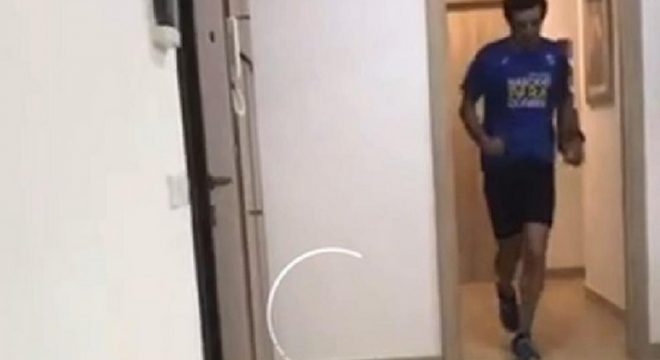 Junior tenta se manter em forma com a ajuda da assessoria de corrida, que envia materiais em vídeo para os membros do grupo. O triatleta já havia corrido uma meia maratona no mesmo apartamento antes de resolver gravar a live.